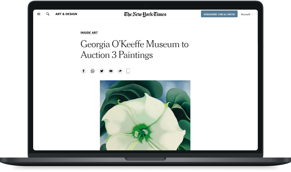 The Georgia O’Keeffe Museum auctioned one of the artist’s iconic flower paintings, Jimson Weed/White Flower No. 1 (1936) at Sotheby’s, setting a record breaking price for a female artist at $44.4 million. The PR efforts on behalf of the museum included proper preparation for a sometimes controversial undertaking–deaccessioning artist’s work in order to refine or build upon a museum’s collection. In addition, JLH worked to bring attention to O’Keeffe’s impact on the art world, the integrity and value of the museum dedicated to her work, and the historic nature of the sale. The O’Keeffe Museum was a JLH client for over five years.